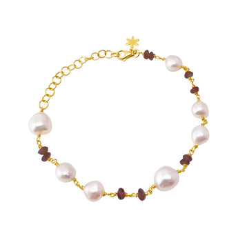 Armlænken er fremstillet i forgyldt sølv med barokke hvide ferskvandsperler og brune røgkvarts.