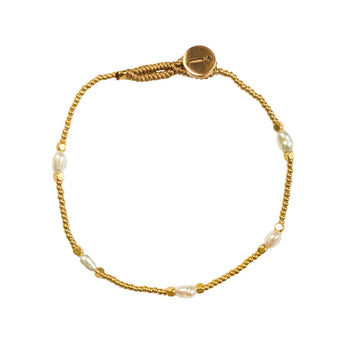 Armbåndet er prydet forgyldte messingperler og barokke ferskvandsperler.