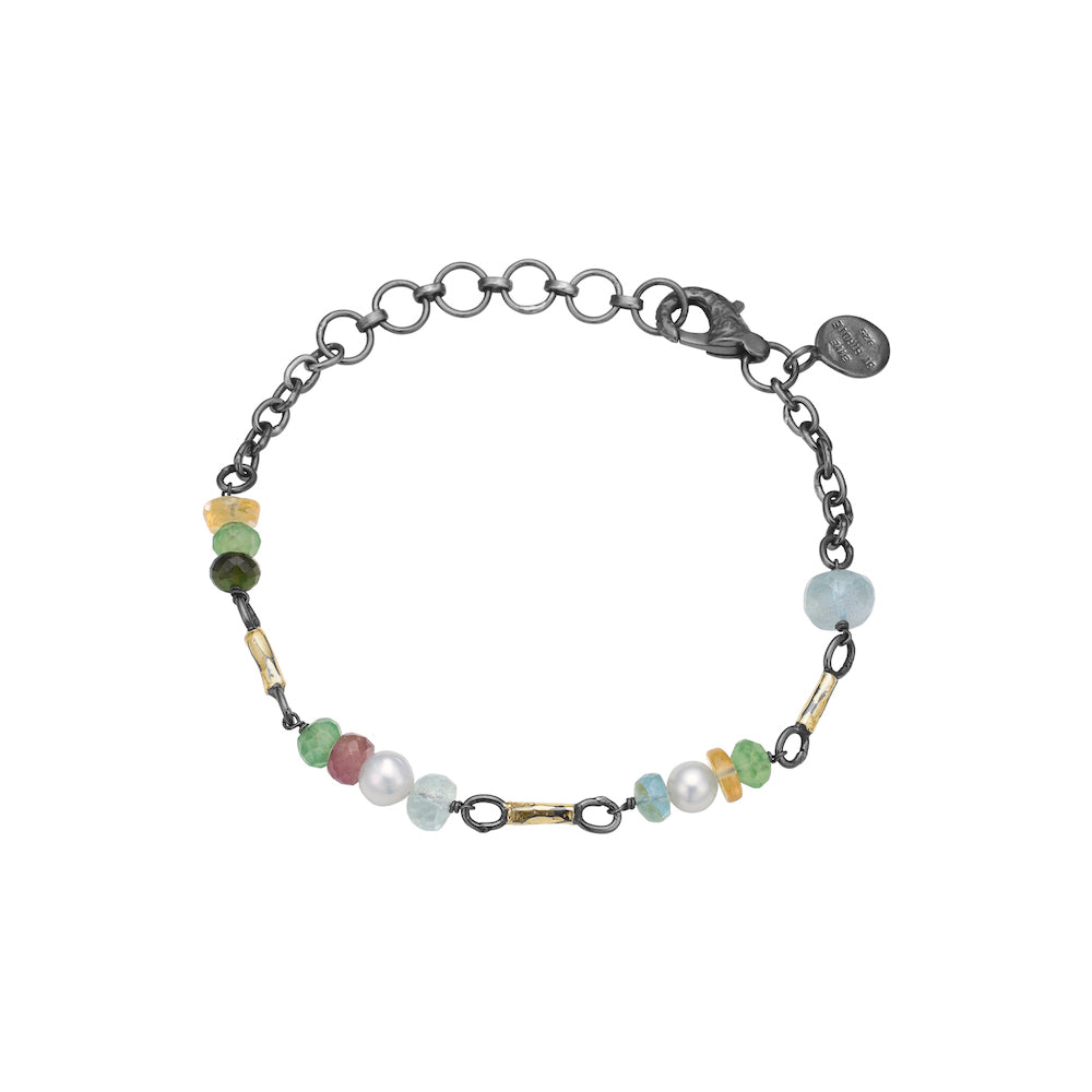 Armlænken er fremstillet i oxyderet sølv og tre led med 18 kt. mundblæst guld. Armlænken er ligeledes prydet med perler, akvamarin, prehnit, citrin og turmaliner.