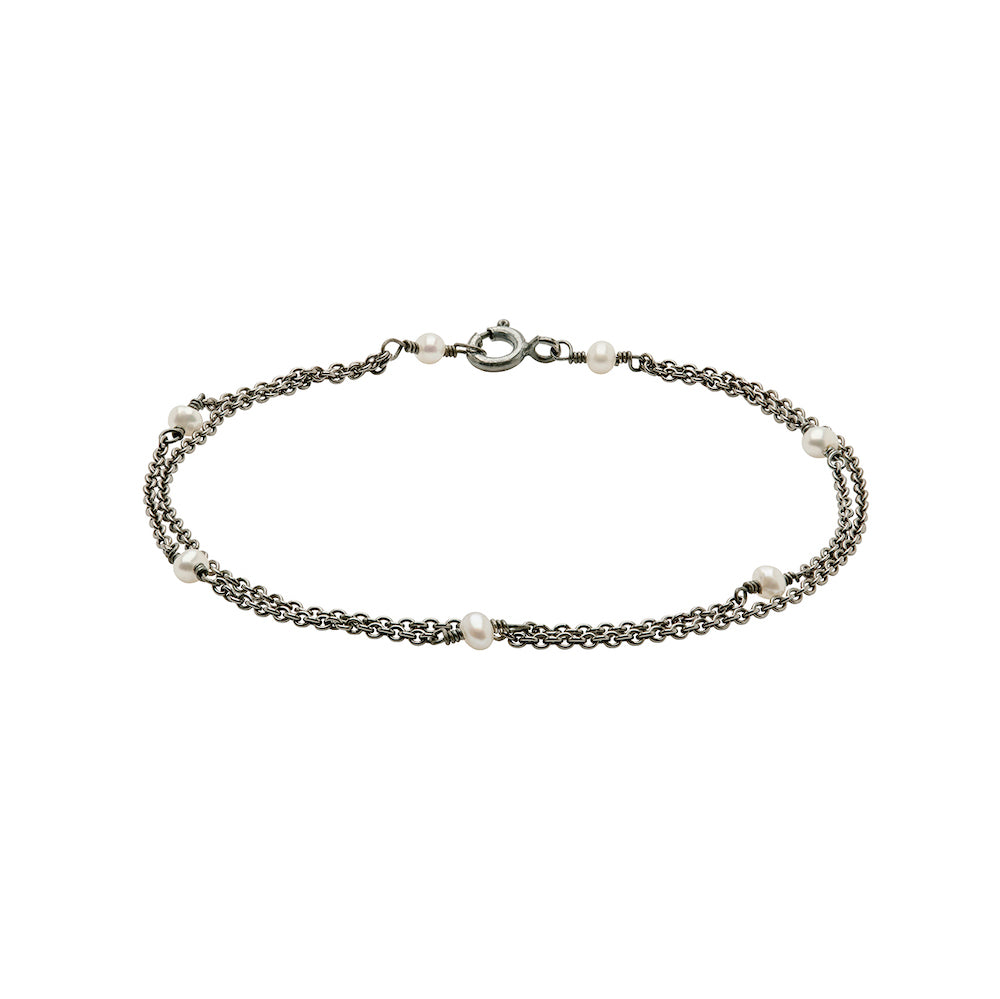 Viklet dobbeltarmbånd i oxyderet sølv med ferskvandsperler.