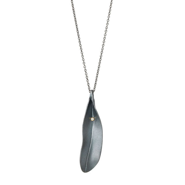 Vedhænget er fremstillet i oxyderet sølv med en brillantsleben diamant (0.02 w/vs) i 14 kt. indfatning.