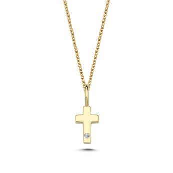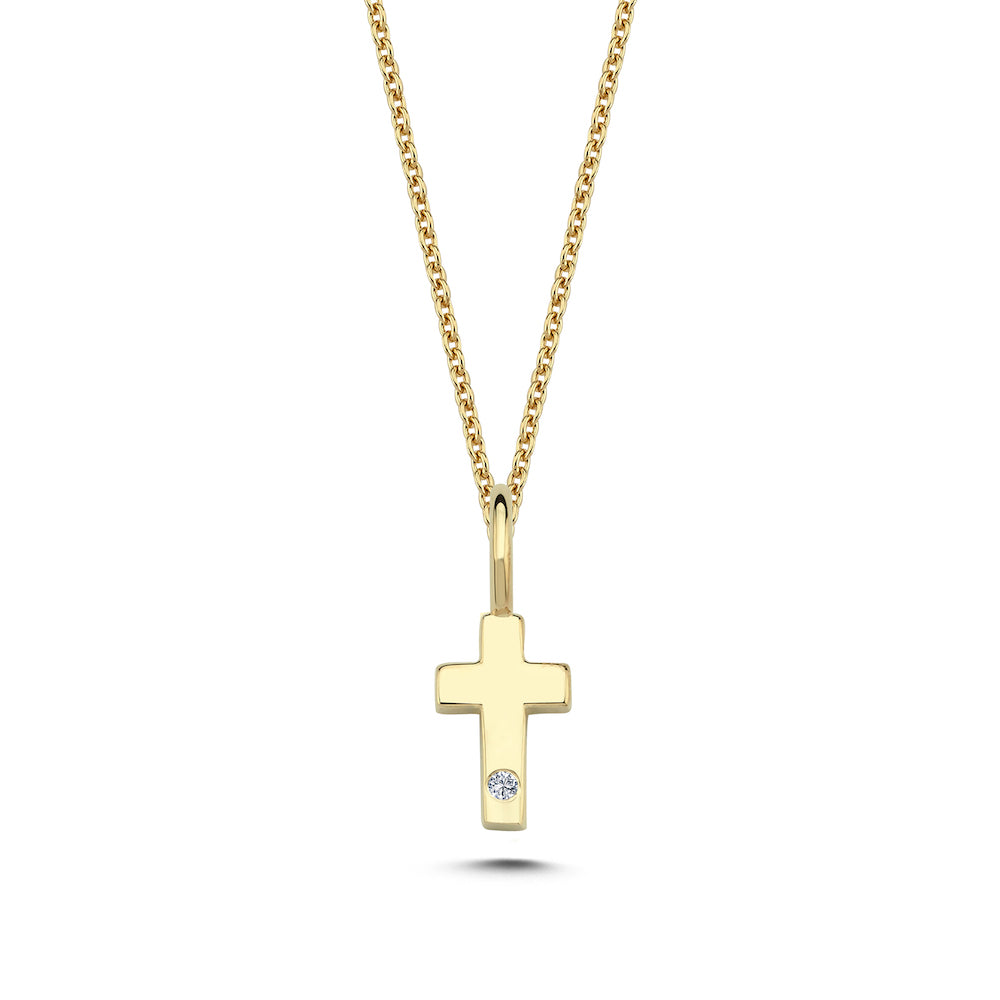 Smukt mini kors vedhæng i 14 karat guld fra det danske smykkefirma NURAN. Vedhænget er prydet med en 0.005ct. w/si brillant.