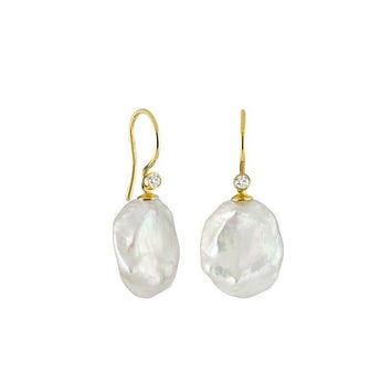 Ørehængerne er i 14 karat guld og prydet med to barokke keshi ferskvandsperler og to brillanter.