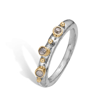 Ringen er fremstillet i sølv med fatninger og guldkugler i 14 kara guld. Ringen er prydet med 3 rose cut diamanter (0.25 ct. i alt).