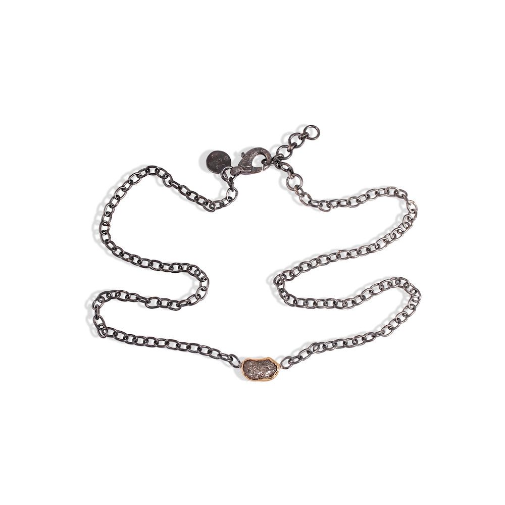 Halskæden er fremstillet i oxyderet sølv og prydet med en smuk rådiamant indfattet i 14 karat guld.