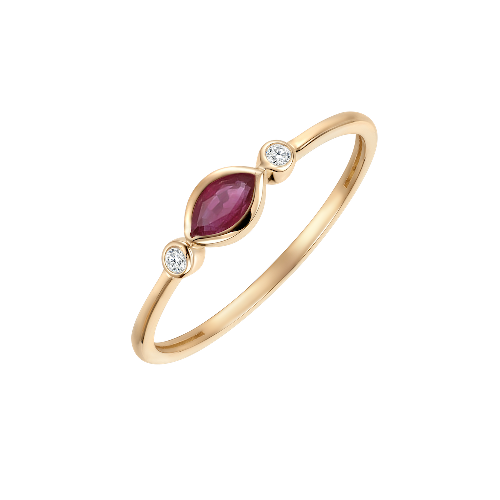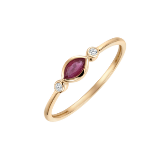 Ringen er prydet med en rød rubin og to brillantslebne diamanter (i alt 0.02ct. w/pk).
