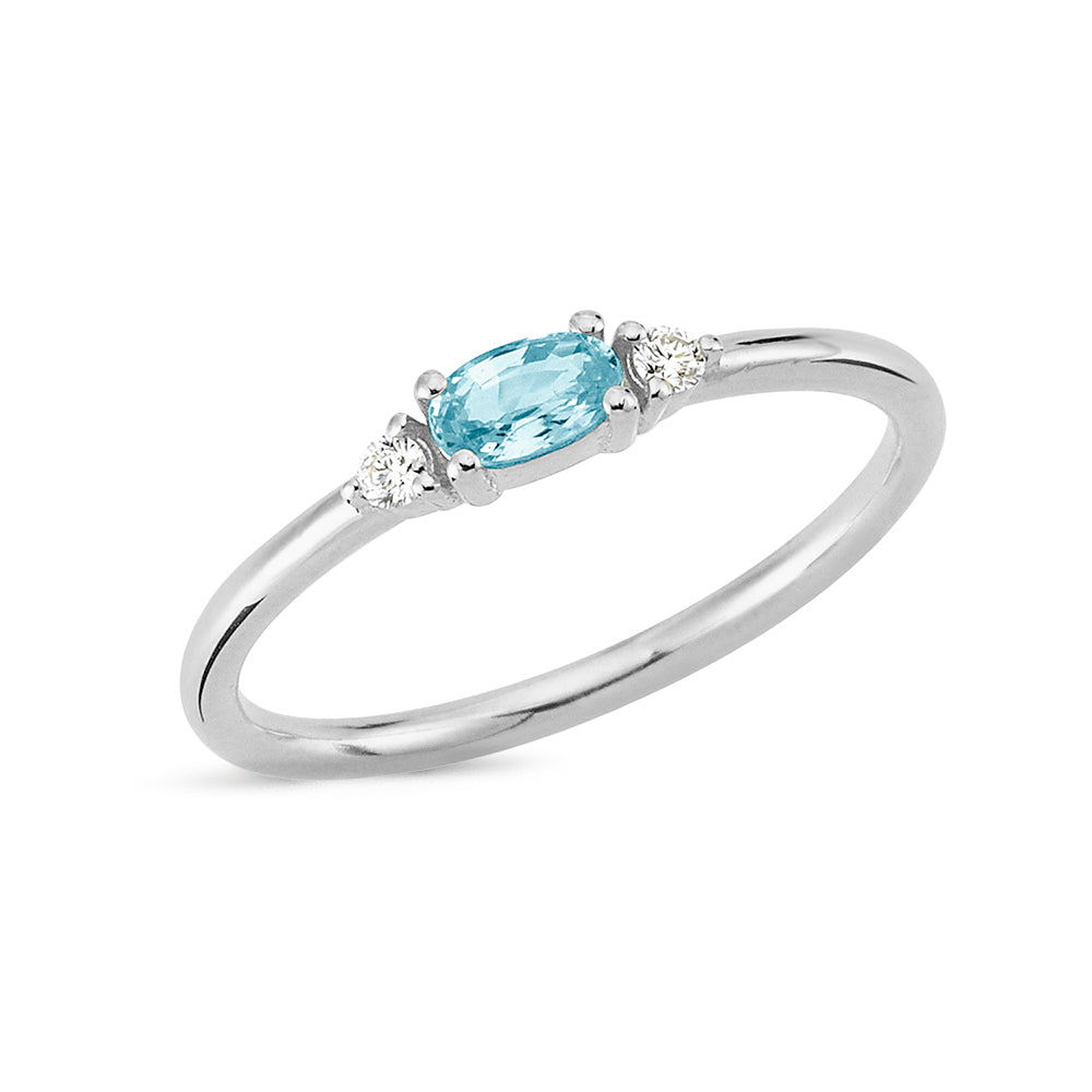 Petit ringen er fremstillet i 14kt. hvidguld med en blå topas og 2×0.025ct W/si brillantslebne diamanter.