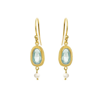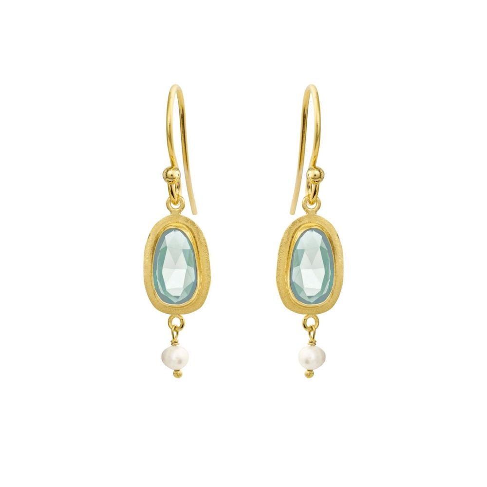 Øreringene er fremstillet i forgyldt sølv og prydet med facetteret grøn kvarts indfattet i forgyldt sølv og med små hvide perler.
