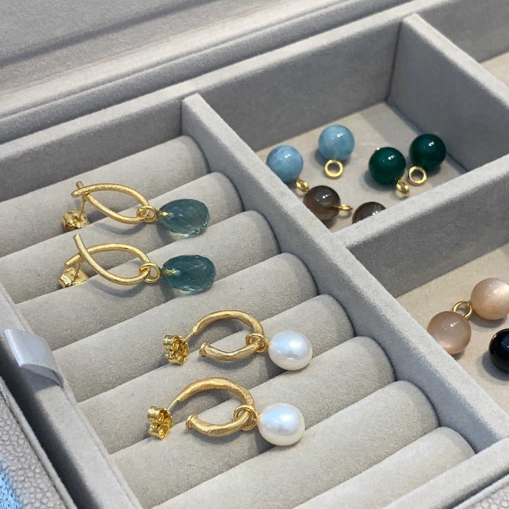 Vedhængene er lavet så de kan bruges på creoler eller de dråbeformede øreringe fra Susanne Friis Bjørner.