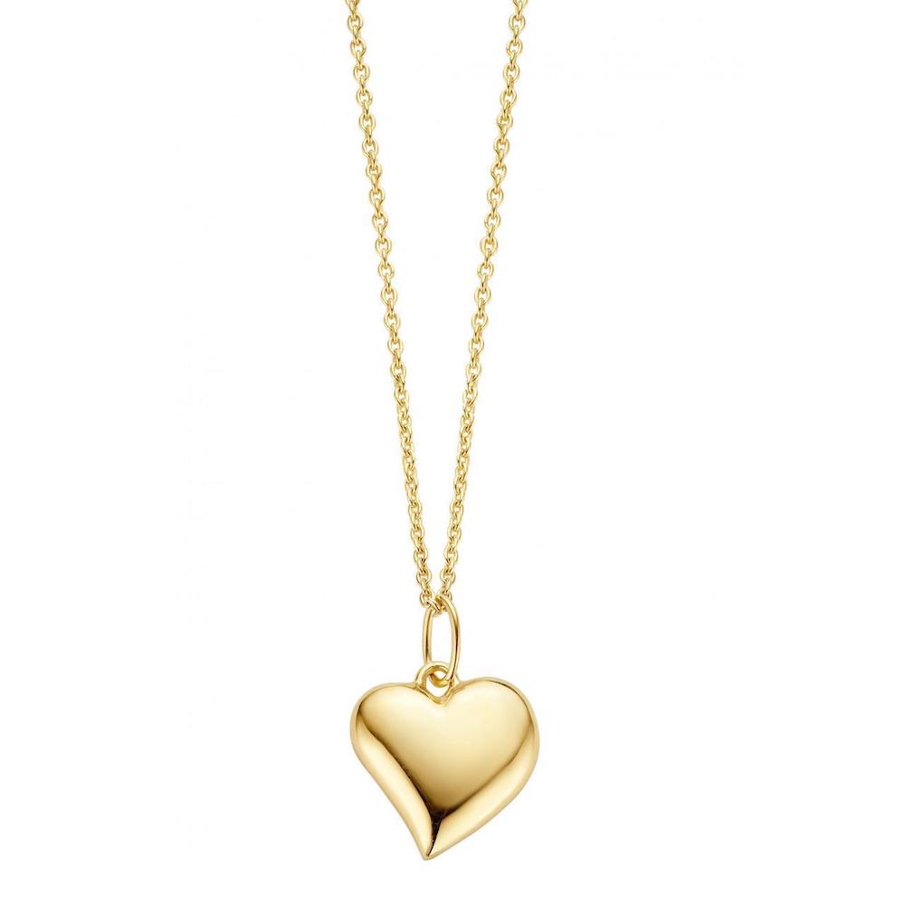Halskæden og det hjerteformede vedhæng er begge i 14 karat guld.