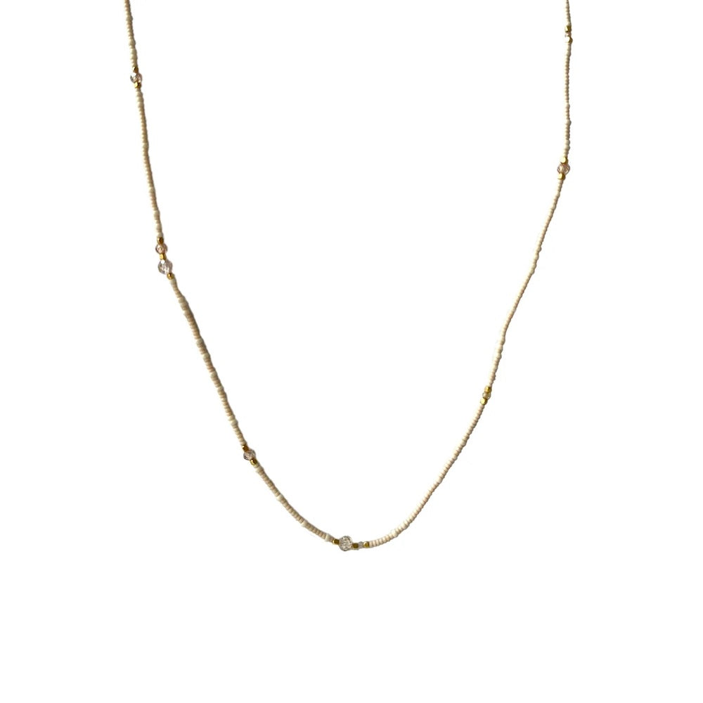 Halskæden er i et mix af beige og hvide glasperler, forgyldt messing og kvarts.