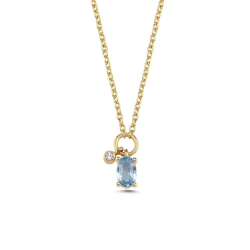 Halskæden er prydet med en medium-blå safir i grabbefatning og en 0.01ct. w. si. brillantslebet diamant i rørfatning.