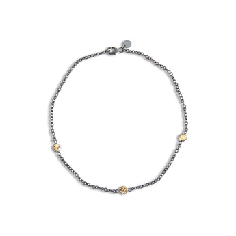 Halskæden er fremstillet i oxyderet sølv og prydet med 18 karat valset guld.