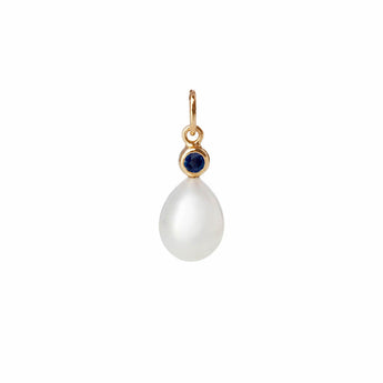 Vedhænget er fremstillet i 14 karat guld og prydet med en hvid oval ferskvandsperle (8-8,5mm) samt en facetteret blå safir.