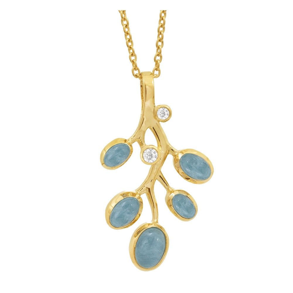 Halssmykket er fremstillet i forgyldt sølv og prydet med blå akvamariner og klare zirkonia.