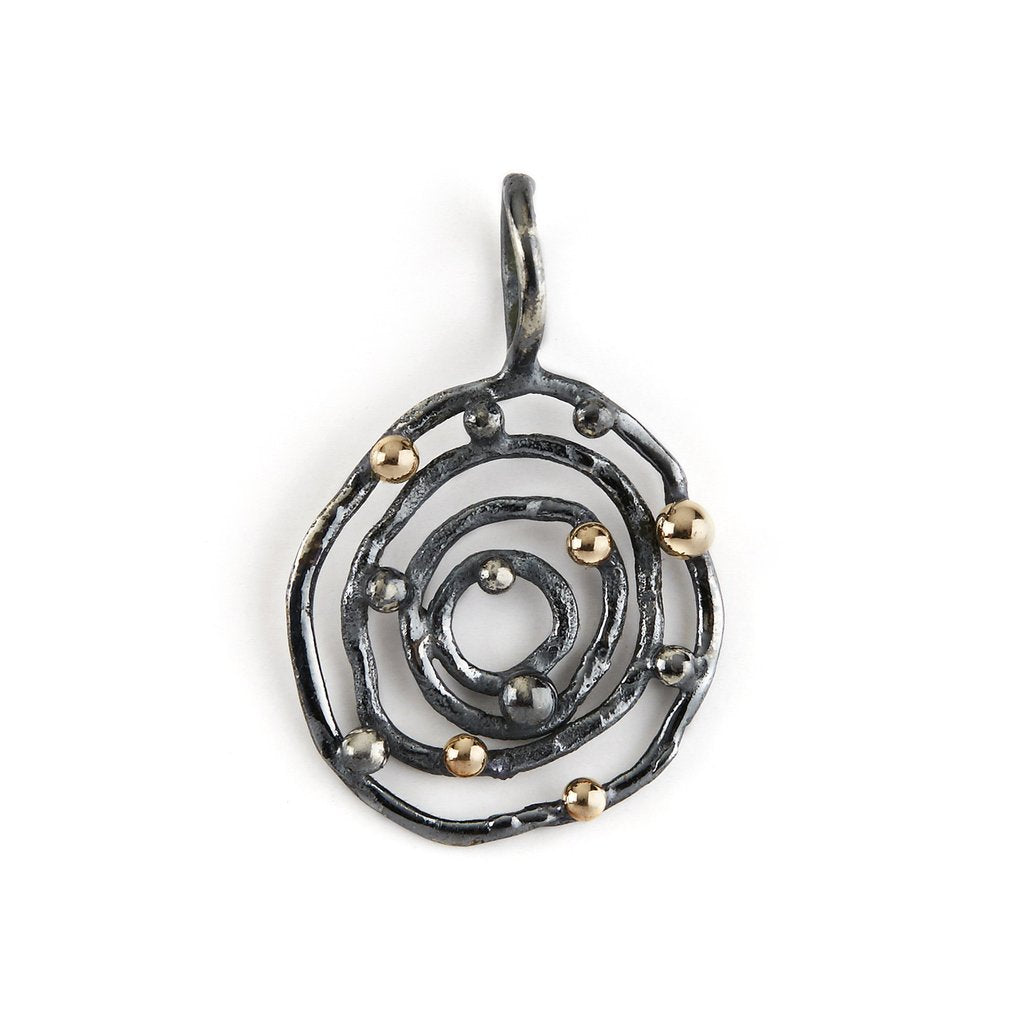 Håndlavet vedhæng i form af spiral lavet i oxyderet sterling sølv med 14 kt guldkugler