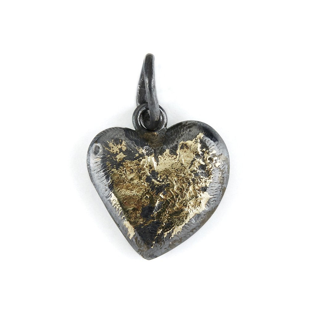 Rustikt, håndlavet hjerte vedhæng i oxyderet sølv med påvalset 18 kt guld