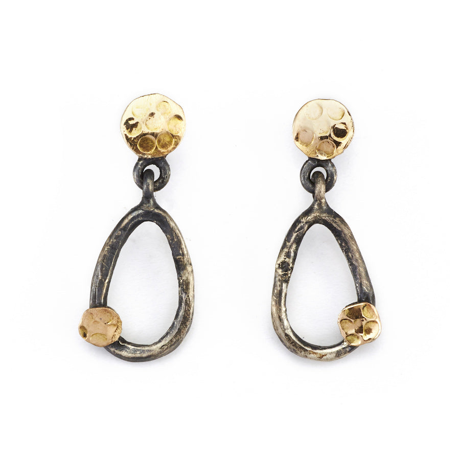 Håndlavet ørehænger i oxyderet sterlingsølv med hamrede plader i 14 kt guld. Ørehængeren er med stik-lukninger.