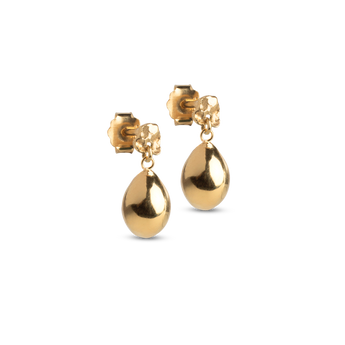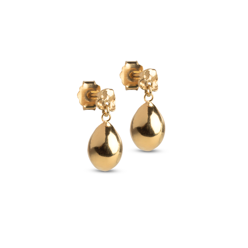 Poe ørestikker i forgyldt sølv fra Enamel Copenhagen. Ørestikkerne er hver prydet med en rustik plade og en blank dråbe i forgyldt sølv.
