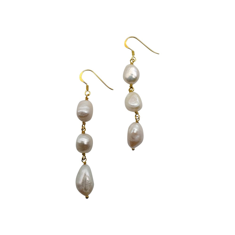 Øreringene er hver prydet med tre barokke ferskvandsperler. Bøjlerne er i forgyldt sterlingsølv.