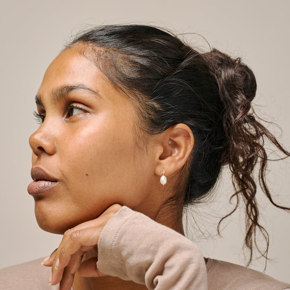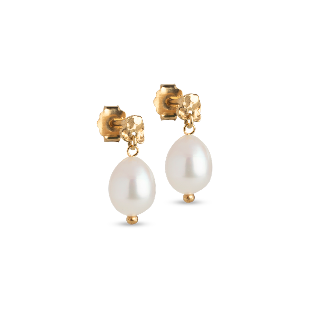 Poe Pearl ørestikker i forgyldt sølv fra Enamel Copenhagen. Ørestikkerne er hver prydet med en rustik plade og hvid ferskvandsperle.