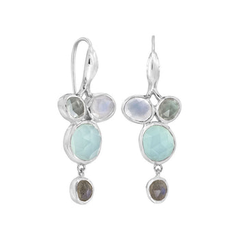 Ørehængerne er fremstillet i sølv og prydet med calcedon, regnbuemånesten, blå kvarts og labradorit.