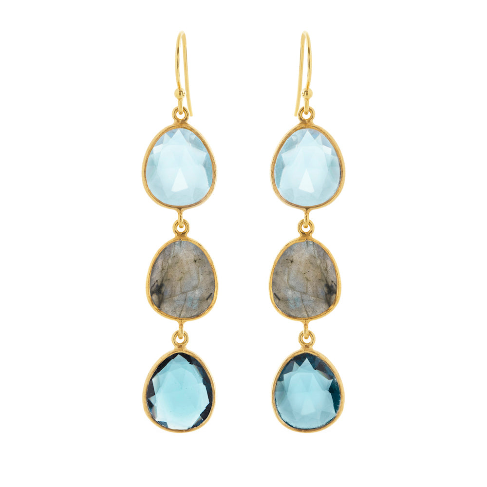 Ørehængerne er prydet med et blåt mix af sten og krystaller. Ørehængerne er prydet med labradorit, London blå krystal og syntetisk blå topas.