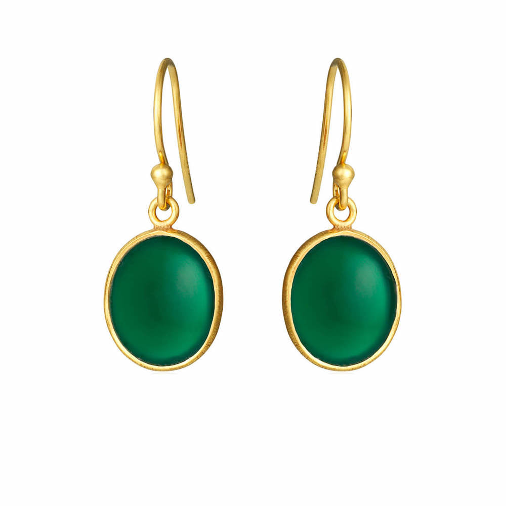 Ørehængerne er fremstillet i forgyldt sølv og prydet med cabochonslebne grønne agater.