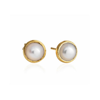 Ørestikker med perler fra det danske smykkemærke Susanne Friis Bjørner. Perlerne er indfattet med en rørfatning i forgyldt sølv. Fatningerne har en matteret overflade.