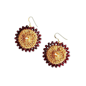 Øreringene består af runde "sole" i hæklet gylden tråd. De er prydet med champagnekvarts og mørkerøde granater. Øreringene er lavet med bøjler i forgyldt sterling sølv.