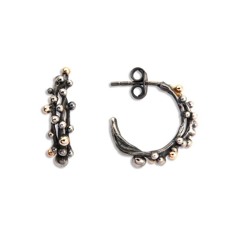 Øreringe fra By Birdie i oxyderet sølv med 14 kt. guldkugler.