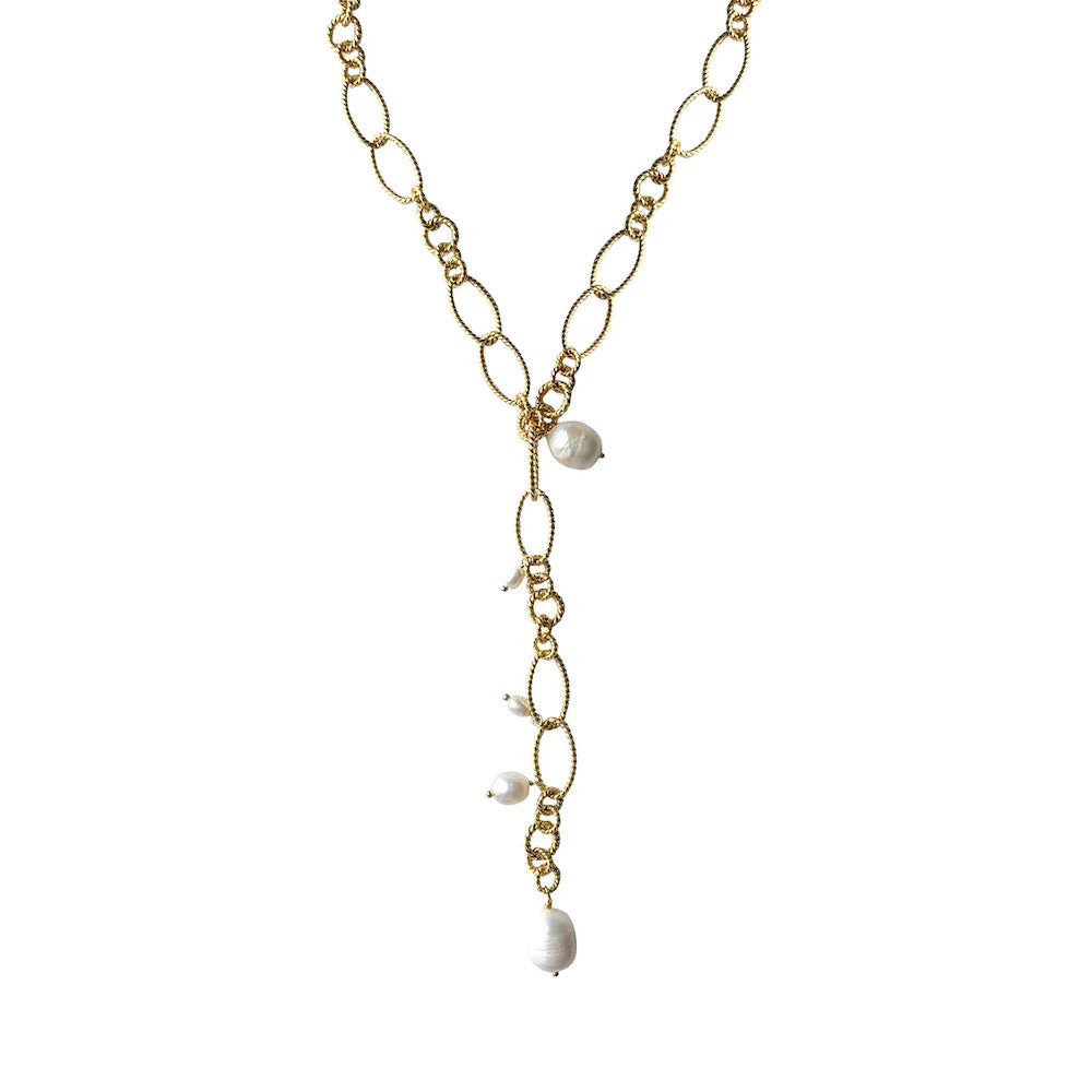 Halskæden er i forgyldt messing og prydet med barokke ferskvandsperler i forskellige størrelser.