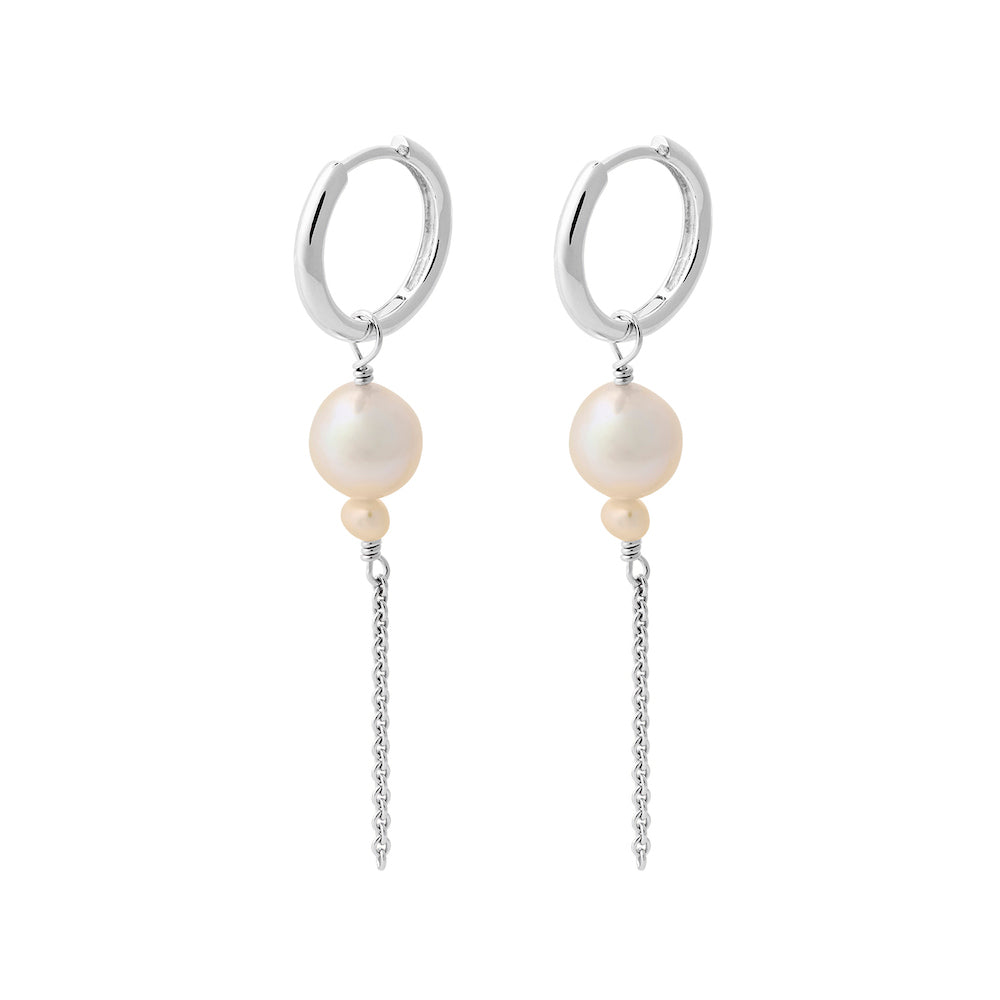 Øreringene består af et par hoops (15mm diameter) med praktisk clicklukning i blank sølv. Vedhængene er prydet af en lille og stor ferskvandsperle og en kæde i sølv.
