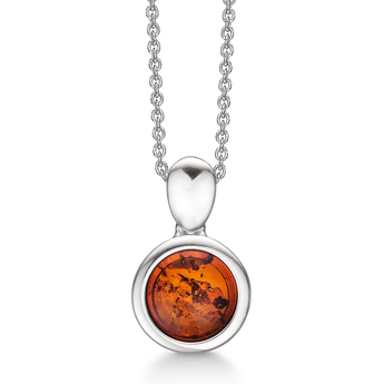 Skøn halskæde i rhodineret sølv med cirkelvedhæng i rav.