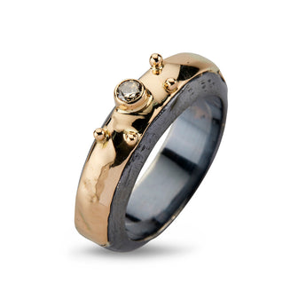 Ringen er fremstillet i oxyderet sølv med et lag 14 karat guld. Ringen prydes af 14 kt. guldkugler og en smuk brillantslebet diamant i guldfatning (i alt 0.10ct.).
