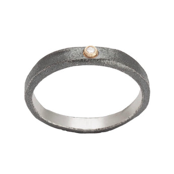 Ringen er fremstillet i matteret oxyderet sølv, hvilket giver den en smuk rustik overflade. Ringen er prydet med en brillantsleben diamant (0.02ct w/vs) indfattet i 14kt. guld.
