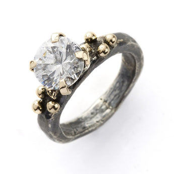 Håndlavet ring i oxyderet sterling sølv med 14 kt guldkugler og stor, facetteret bjergkrystal fra den danske smykkedesigner Birdie.