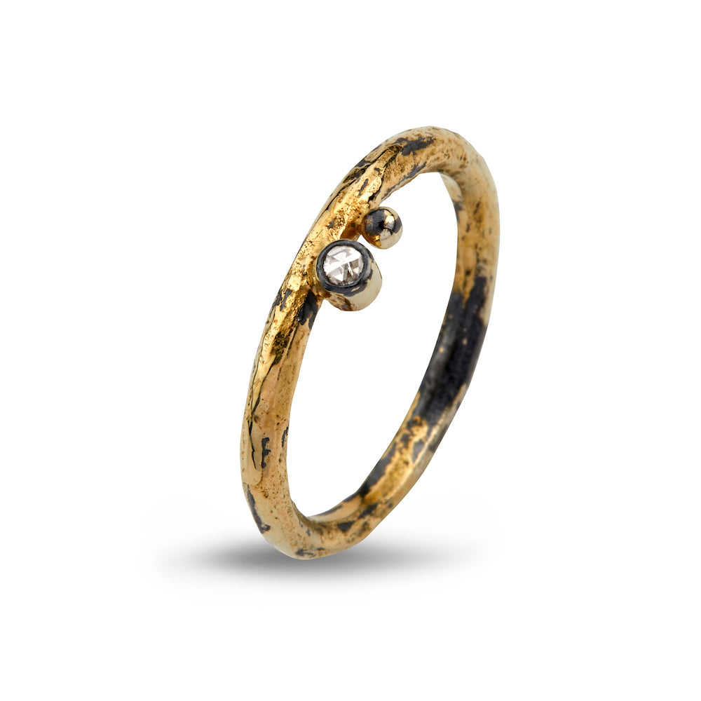 Ringen er fremstillet i oxyderet sølv med mundblæst 18 kt. guld og en rosensleben diamant (0.04ct.).