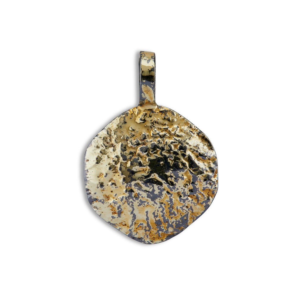 Vedhænget er fremstillet i oxyderet sølv og overfladen er prydet med 18 karat valset guld.