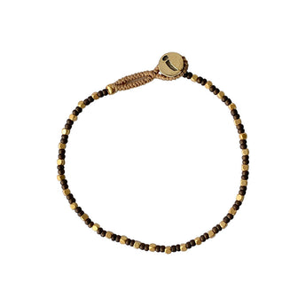 Armbåndet er prydet med et mix af gyldne messingperler og brune glasperler.