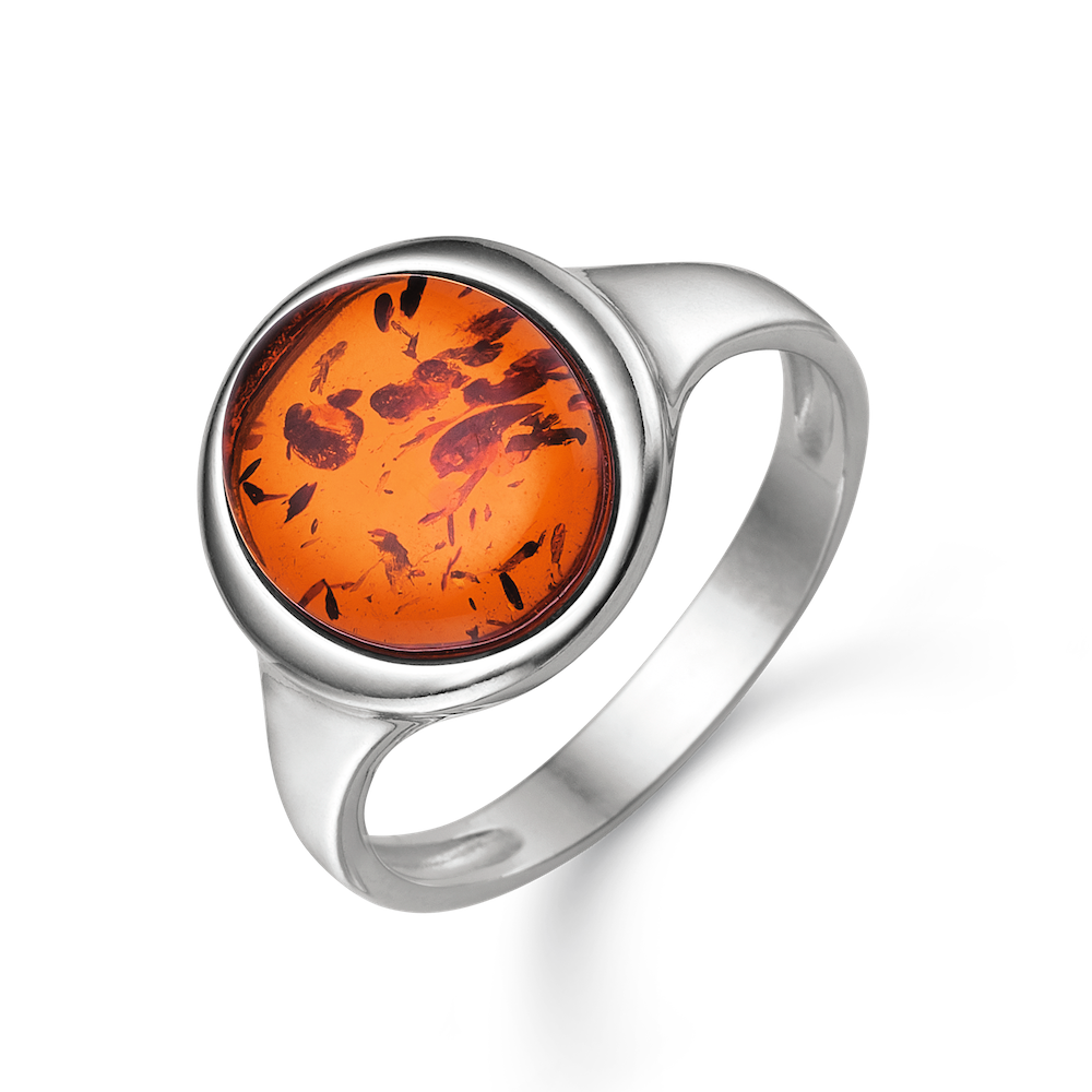 Smuk ring i rhodineret sølv med et ovalt stykke rav.