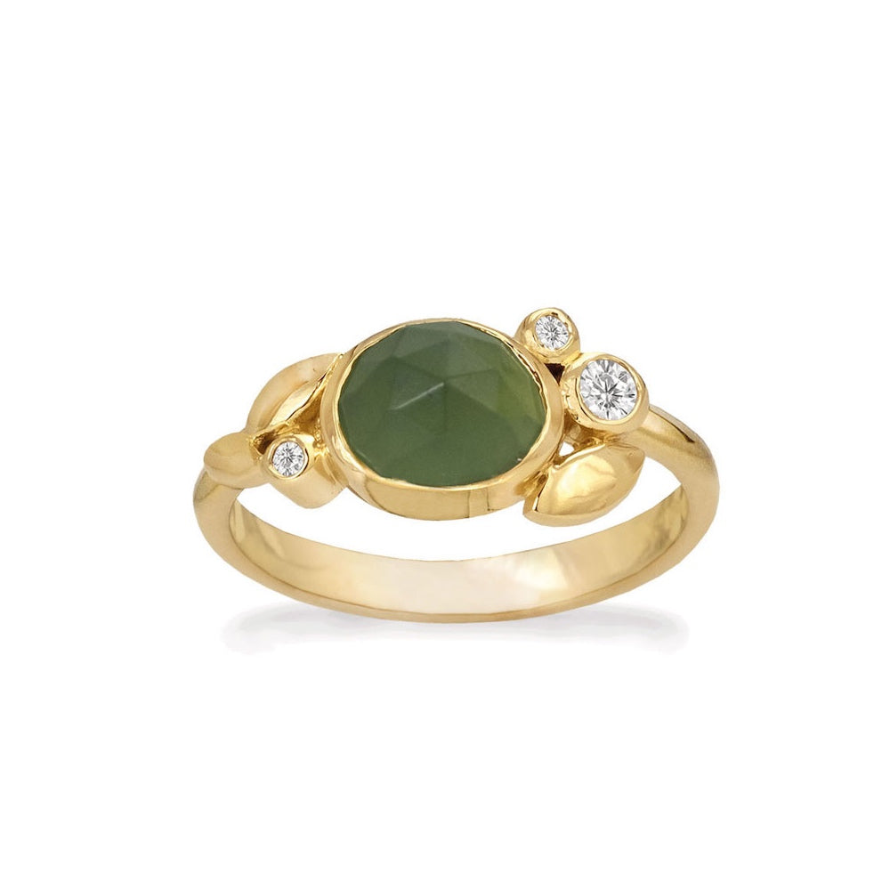 Ringen er fremstillet i forgyldt sølv og prydet med en grøn serpentin og tre zirkonia.