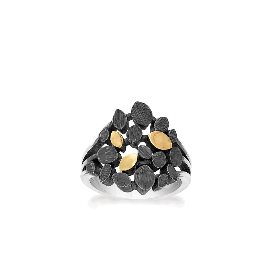 Ringen er fremstillet i oxyderet sølv med detaljer i 14 karat guld.