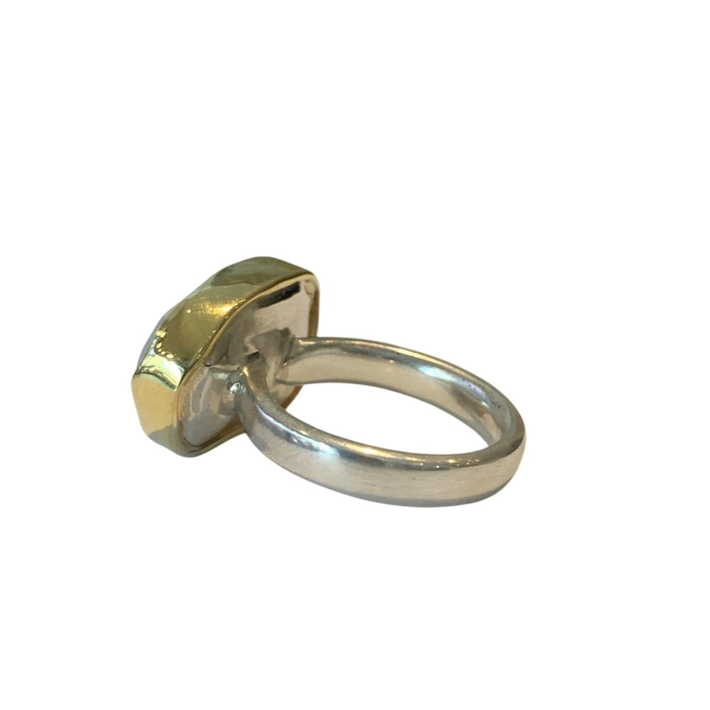 Ringen er håndlavet med en kraftig ringskinne i let-matteret sterlingsølv og en indfatning i 18 karat guld.