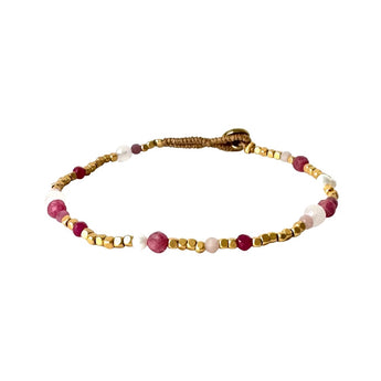 Sweet Gold armbånd fra Ibu Jewels. Armbåndet er prydet med messingperler, ferskvandsperler, samt lyserøde og pink sten.